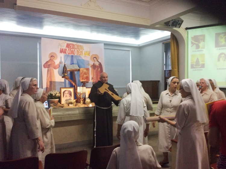 À tarde, fomos convidadas a trabalhar em grupo. Fazendo ressonância de tudo o que ouvimos cada grupo definiu um propósito para viver a misericórdia na sua fraternidade. Dentre tantas propostas, uma muito importante e que abrange as demais é Abrir-se para acolher os gestos amorosos um dos outros e ir ao encontro da/o outra/o como Francisco foi ao encontro do leproso e o beijou. E, para aprofundar a necessidade deste ir encontro, Fr. Vitório nos relatou 3 tipos de beijos de Deus que manifestam a Sua misericórdia. O primeiro é o beijo que Deus nos dá pela criação – Deus está em todas as coisas; sua misericórdia se manifesta na sua obra criada. O segundo beijo ele nos dá através da sua ENCARNAÇÃO – pela encarnação Ele toma a forma humana – devolve para nós na Eucaristia; diviniza o humano e humaniza o divino. E o terceiro beijo ele nos dá através do SOPRO – soprou e enviou o seu Espírito sobre a vida. Concluiu dizendo que SAIR é fazer vibrar o coração de alguém. A aproximação é muito importante nos dias de hoje, pois as pessoas estão vazias de encontro. E, para a mística franciscana a afetividade e a espiritualidade não se separam; o que cura o vazio existencial das pessoas é a clínica do coração humano.